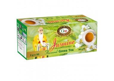 Aromatisierter grüner Tee mit Jasminblüten, verpackt im Teebeutel.