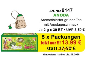 Aromatisierter grüner Tee mit Anoda, verpackt im Teebeutel.