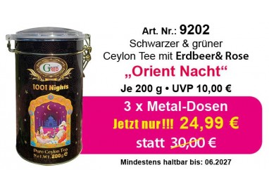 3 x je 100 Gr. Schwarzer Ceylon Tee mit Rosen- und Jasminblüten. Verpackt in einer metallischen Dose, geformt wie eine Vase.